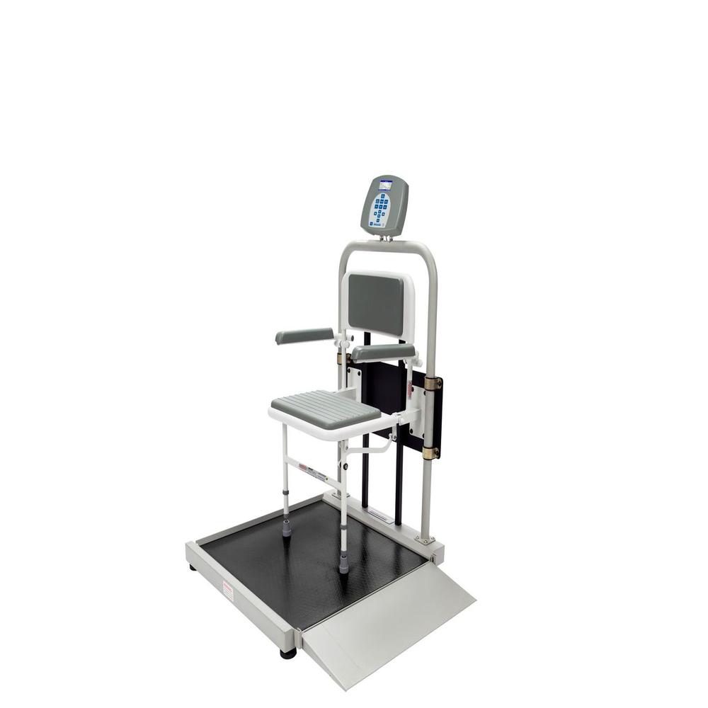 Health o meter® Professional's 2500CKL single-ramp wheelchair scale is perfect for standard-size wheelchairs and features a fold-away chair for patients that need to be seated when weighed. The all-digital scale is designed to meet the needs of doctor’s offices, hospitals, clinics, and acute and long-term care facilities. The 2500CKL scale has a capacity of 1000 pounds (454 kg) for the platform with a seat capacity of 419 lb (190 kg). Among the wheelchair scale's many functions are body mass index (BMI), tare and pre-tare, LB/KG conversion and lock out, reweigh, recall, auto zero, and auto off.